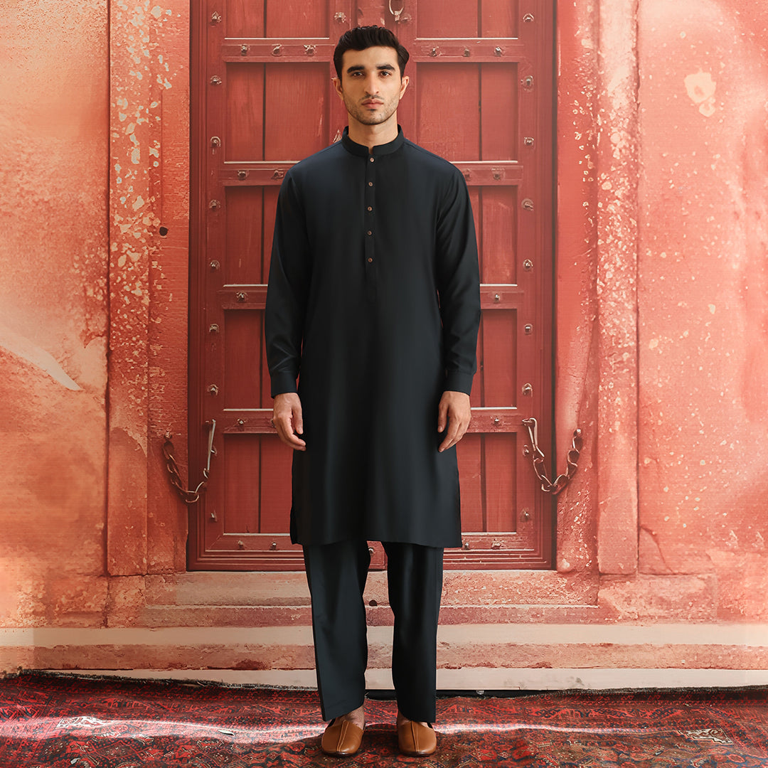 Crafted in Pakistan as part of the summer 25 collection, this Scarab suit is constructed using a blend of poly viscose to create a crease resistant garment that is iron-easy, elegant and offers a versatile range of wear ability. It features a Normal Collar, Normal Placket with plain features. The garment is perfect for evening wear and occasions. Cut in a Slim fit, which is an easy fit through the chest and sleeves with a tailored waist and hip – this two piece suit comes complete with a matching Scarab Slim  fit Shalwar in the same poly viscose fabric.