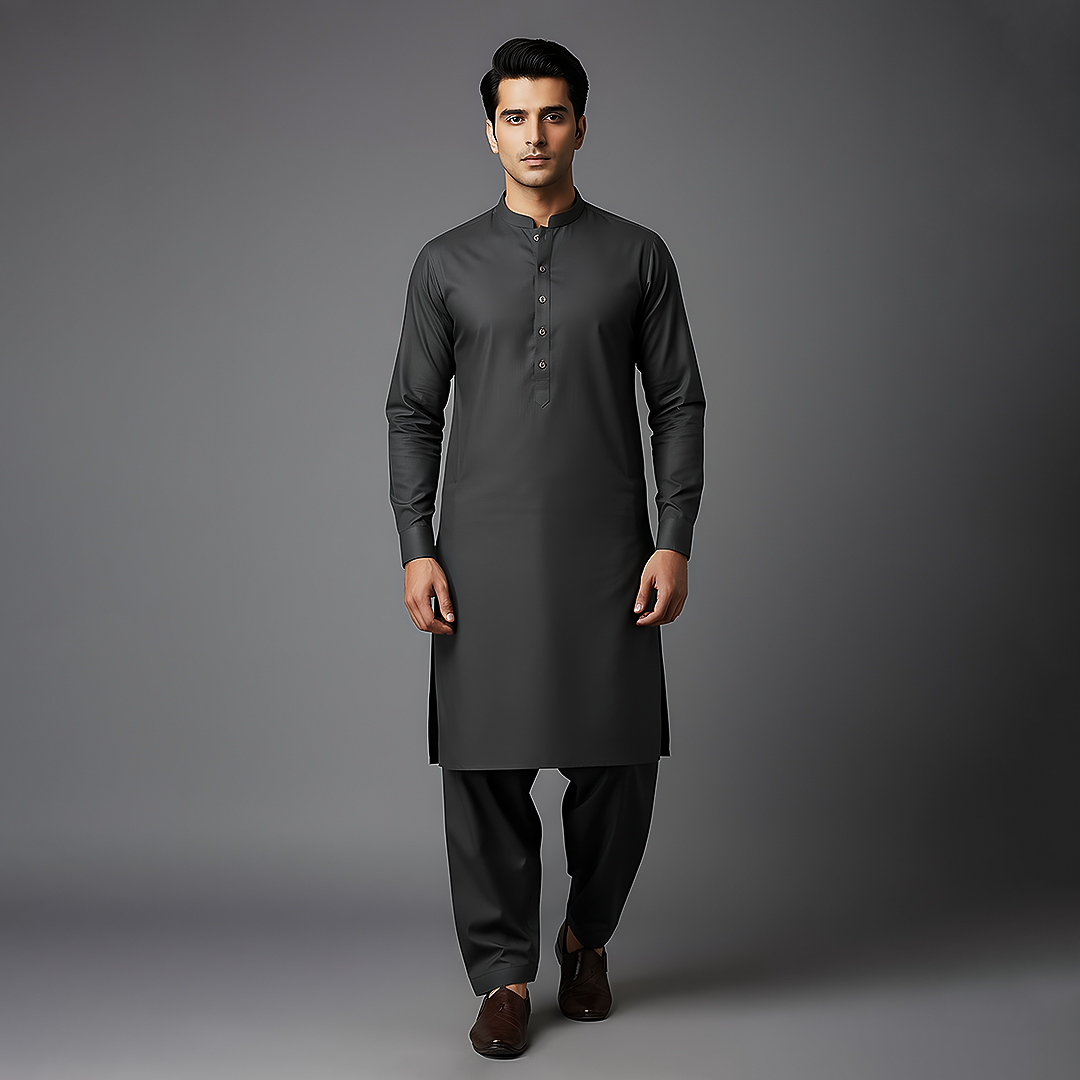 Crafted in Pakistan for the Summer 25 Collection, this Tap Shoe Suit is made from a poly viscose blend that’s crease-resistant, iron-easy, and elegant. Featuring a normal collar and plain placket, it’s ideal for formal occasions and evening wear.