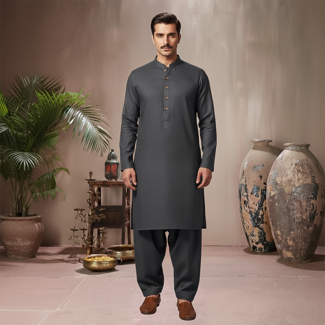 Crafted in Pakistan for the Summer 25 Collection, this Graphite Suit is made from a Poly Viscose blend that’s crease-resistant, iron-easy, and elegant. Featuring a normal collar and plain placket, it’s ideal for formal occasions and evening wear.