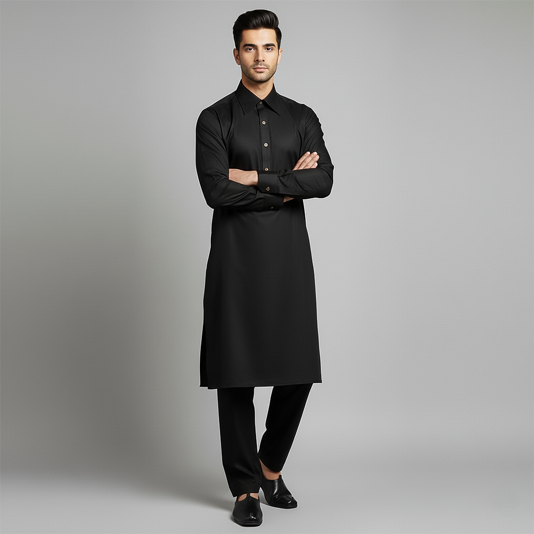 Crafted in Pakistan for the Summer 25 Collection, this Tap Shoe Suit is made from a poly viscose blend that’s crease resistant, iron easy, and elegant. Featuring a normal collar and plain placket, it’s ideal for formal occasions and evening wear.