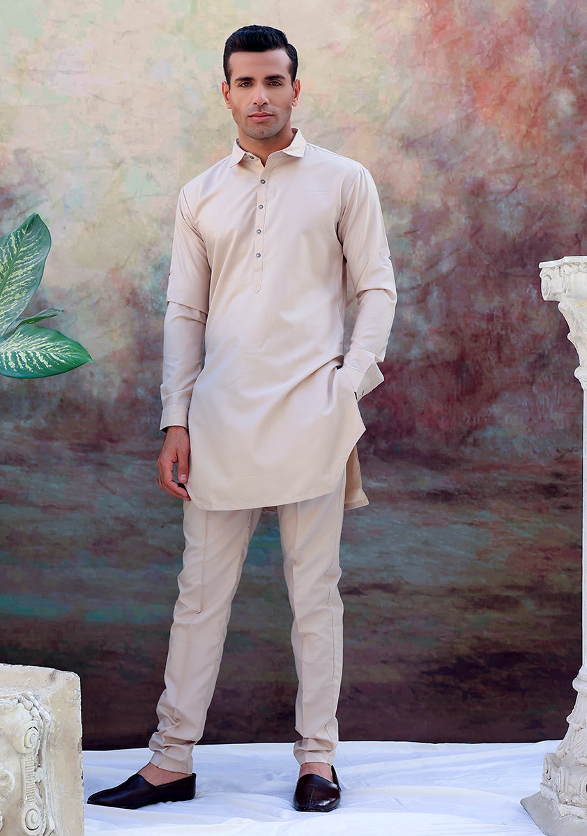 Crafted in Pakistan as part of the Spring 22 collection, this Beige suit is constructed using a blend of poly viscose to create a crease resistant garment that is iron-easy, elegant and offers a versatile range of wear ability. It features a Normal Collar, Normal Placket, and a Soft Square Cuff. The garment is perfect for evening wear and occasions. Cut in a Modern fit, which is an easy fit through the chest and sleeves with a tailored waist and hip – this two piece suit comes complete with a matching Beige Modern Fir Pent Pajama in the same poly viscose fabric.