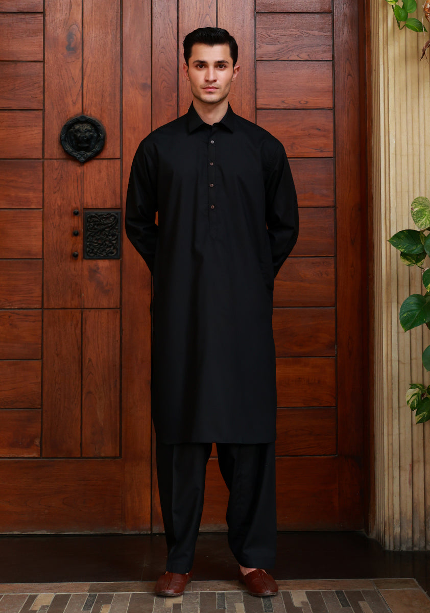 Crafted in Pakistan as part of the summer 25 collection, this Tap Shoe suit is constructed using a blend of poly viscose to create a crease resistant garment that is iron-easy, elegant and offers a versatile range of wear ability. It features a Shirt Collar, Normal Placket with plain features. The garment is perfect for evening wear and occasions. Cut in a Slim fit, which is an easy fit through the chest and sleeves with a tailored waist and hip – this two piece suit comes complete with a matching Tap Shoe shalwar in the same poly viscose fabric.