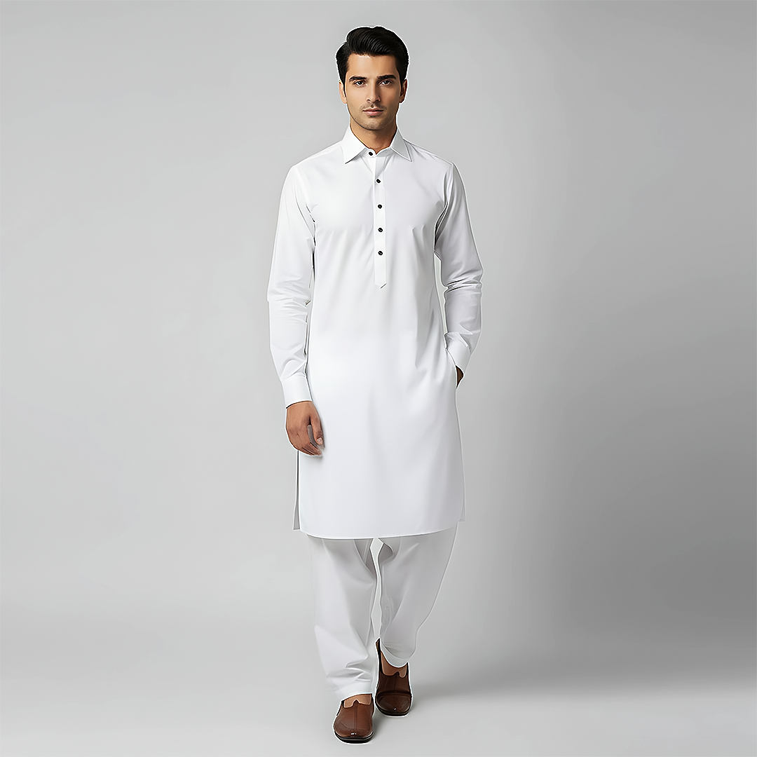 Crafted in Pakistan for the Summer 25 Collection, this Cloud Dancer Suit is made from a Cotton Silk blend that’s crease-resistant, iron-easy, and elegant. Featuring a normal Shirt collar and plain placket, it’s ideal for formal occasions and evening wear.