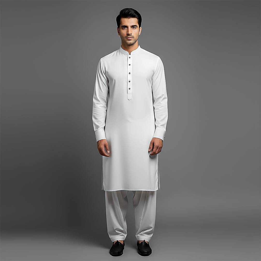 Cut in a Slim fit for comfort and shape, this two-piece suit includes a matching Cloud Dancer shalwar in the same refined fabric perfect for modern groom wear or formal events.