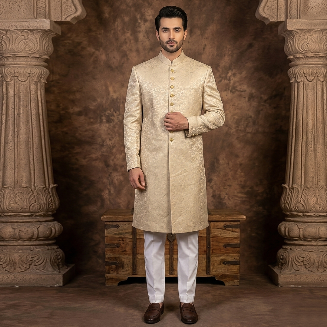 Premium Kambal Jamawar Almond buff Traditional Sherwani