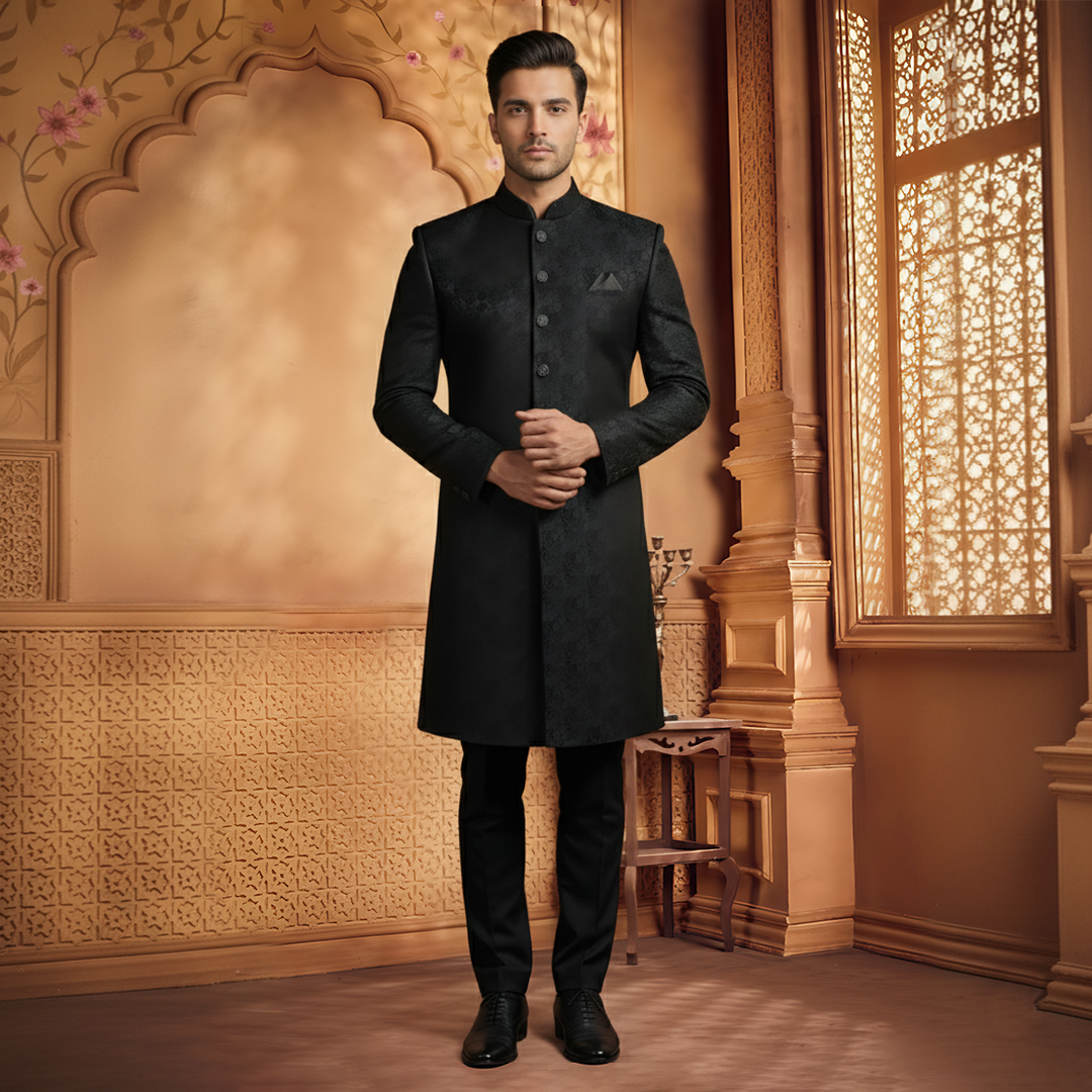 Premium Viscose Jamawar Black Traditional Sherwani