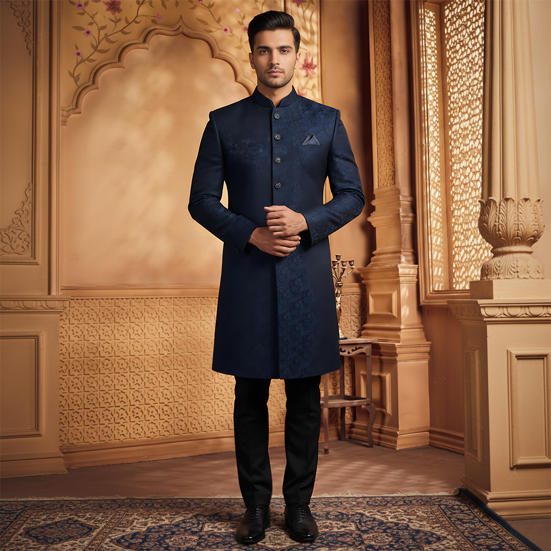 Premium Viscose Jamawar Blue Traditional Sherwani