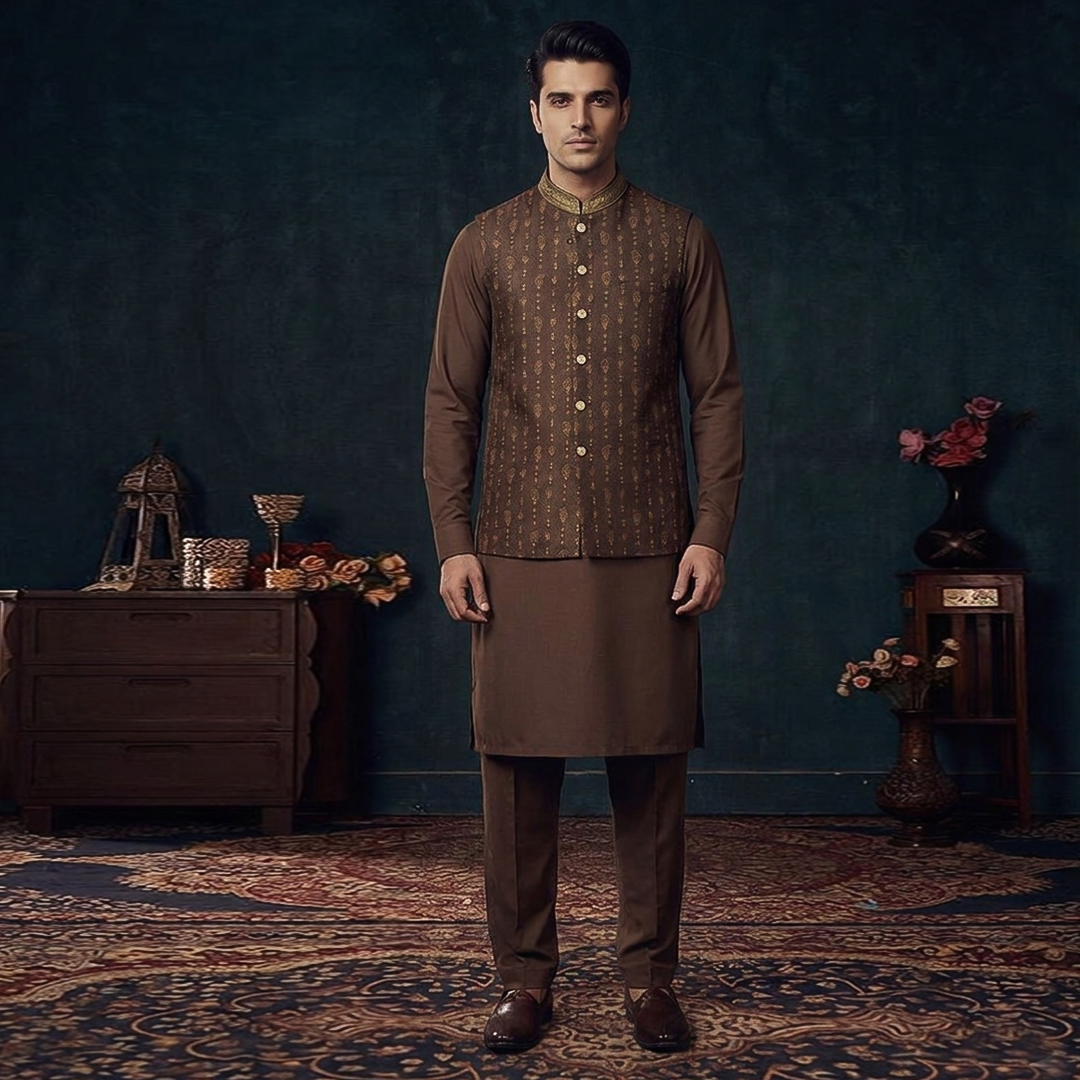 Amir Adnan is renowned for his exceptional designs in waistcoats, which are a quintessential component of traditional Pakistani attire, often worn over Shalwar Kameez or paired with Western outfits to add a touch of elegance and sophistication. His waistcoats epitomize craftsmanship, attention to detail, and a blend of tradition with contemporary flair.