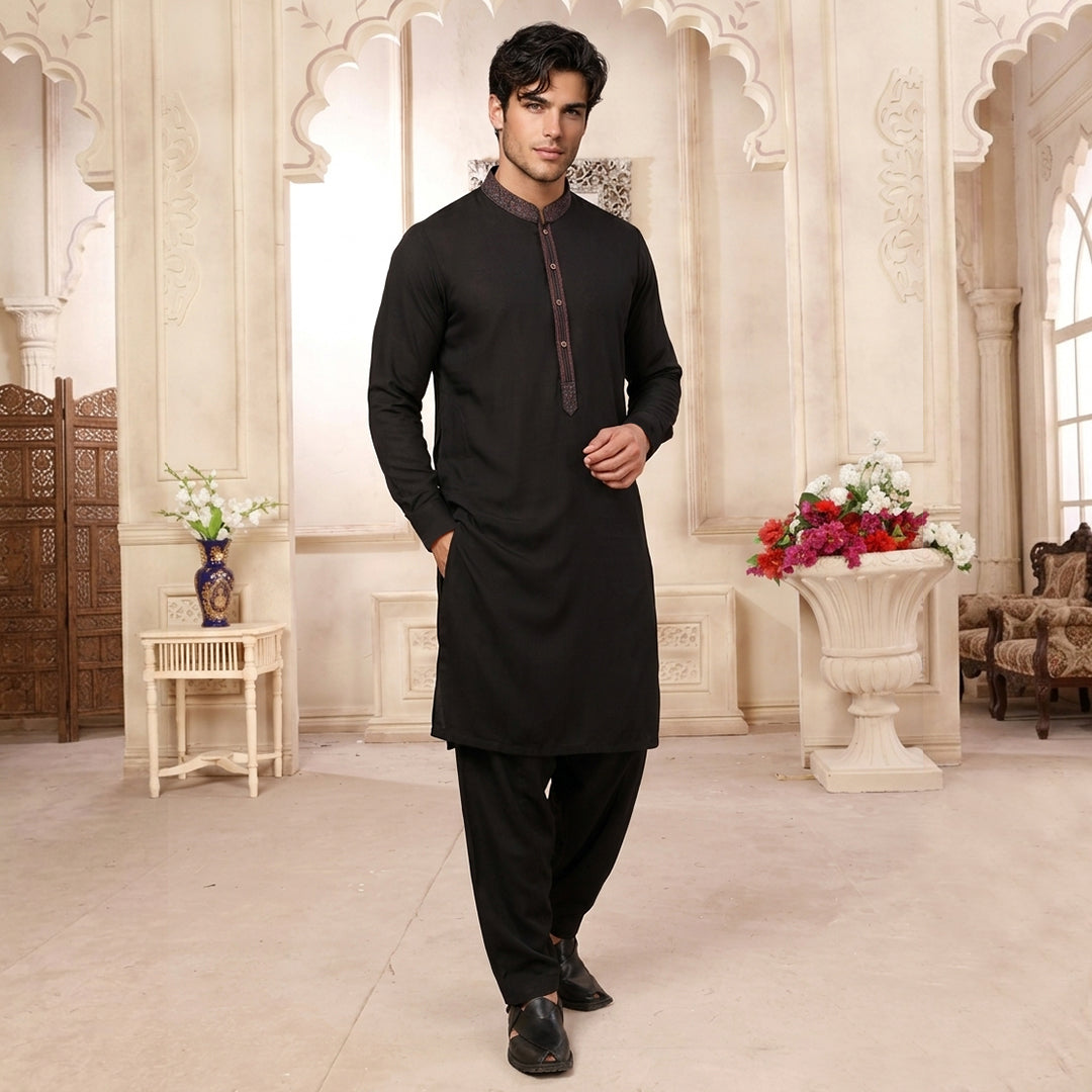 Crafted in Pakistan for the Summer 26 Collection, this Tap Shoe Suit is made from a poly viscose blend that’s crease-resistant, iron-easy, and elegant. Featuring a normal Embroidered collar and placket, it’s ideal for formal occasions and evening wear. Cut in a classic fit for comfort and shape, this two-piece suit includes a matching Tap Shoe shalwar in the same refined fabric, perfect for formal events.
