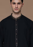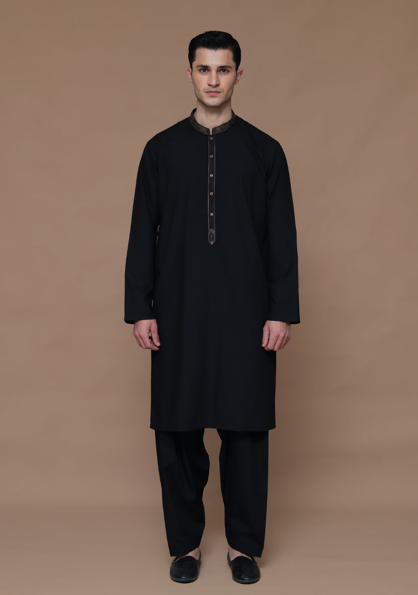 Crafted in Pakistan as part of the summer 25 collection, this Tap Shoe suit is constructed using a blend of poly viscose to create a crease resistant garment that is iron-easy, elegant and offers a versatile range of wear ability. It features a Embroidered Collar, Normal Placket with plain features. The garment is perfect for evening wear and occasions. Cut in a Classic fit, which is a tapered fit through the chest, sleeves waist and hip – this two piece suit comes complete with a matching Tap Shoe Shalwar in the same poly viscose fabric.